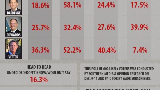 Against the other declared candidates for governor, U.S. Sen. David Vitter of Metairie, a Republican, leads in the SMOR poll with 36 percent. He’s followed by state Rep. John Bel Edwards of Amite, the lone Democrat, at 26 percent. The two other Republicans trailed, with Lt. Gov. Jay Dardenne of Baton Rouge at 19 percent and Public Service Commissioner Scott Angelle of Breaux Bridge at 3 percent. The undecided vote totaled 16 percent.