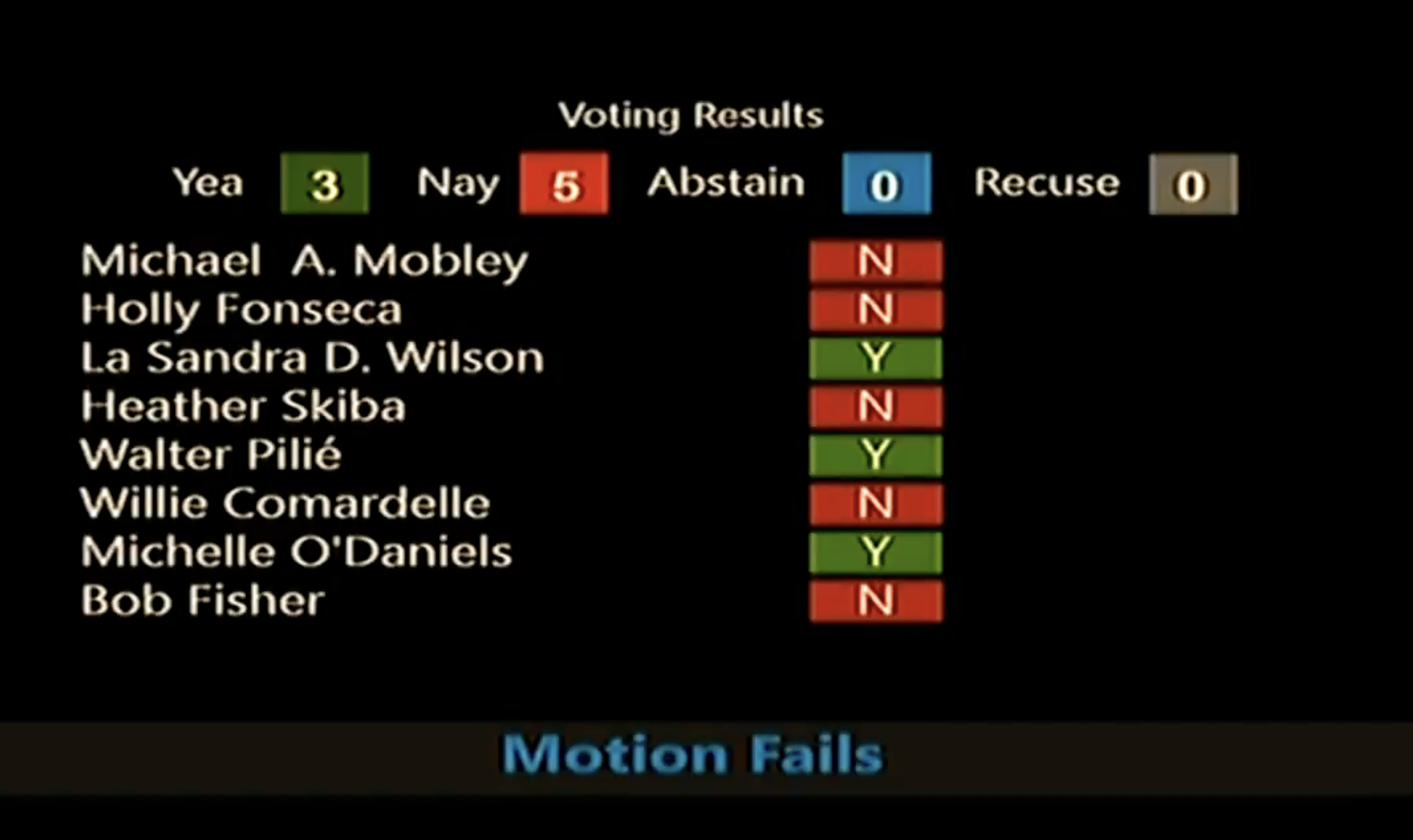 Council members Michael Mobley, Holly Fonseca, Heather Skiba, Willie Comardelle and Bob Fisher voted against the moratorium.
