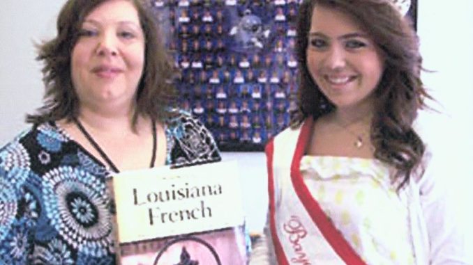 Cajun French Music Association Bayou Cajun Chapter Queen Jaclyn Sutton presented a Louisiana French dictionary to the French teacher, Ann Ardoin, at Allemands Elementary School.
