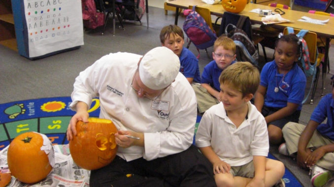 Chef Ed Rhinehart carves a pumpkin in Mrs. Mender’s kindergarten class at New Sarpy Elementary.