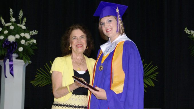 “It is quite rewarding to be able to present our scholarship to such a smart and gifted person,” said Doris Menezes, widow of the late principal and coach, who made the presentation of the award at Friday’s graduation ceremony. “Megan has worked extremely hard and has excelled in the classroom, in the arts, and in the community. Hahnville’s scholarship committee selected an outstanding student and we’re pleased to be able to contribute to her continuing education as she attends college.”