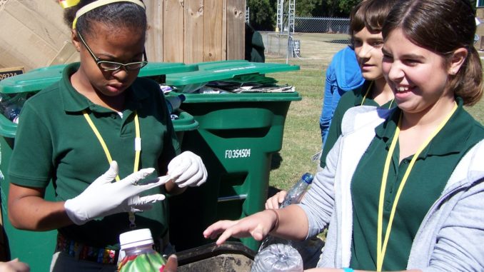 Pictured are Hurst 7th grade students (left to right) Annie Britton, Alex Boteler, and Sarah Gauthier sort items into the different recycle bins donated by Phoenix Recycling as part of the Green Team Project.
