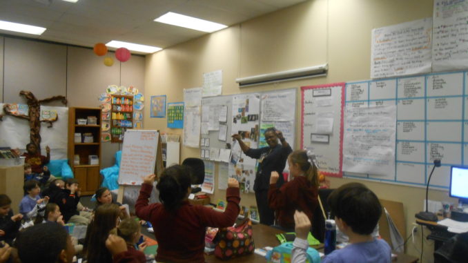 Michelle Adkins’s and Lauren Mire’s classes are seen here practicing for the black history program at Lakewood Elementary.