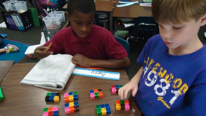Alavan Sam and Christian Bourgeois work together in Michelle Adkins third Grade math class to solve division problems using manipulatives.