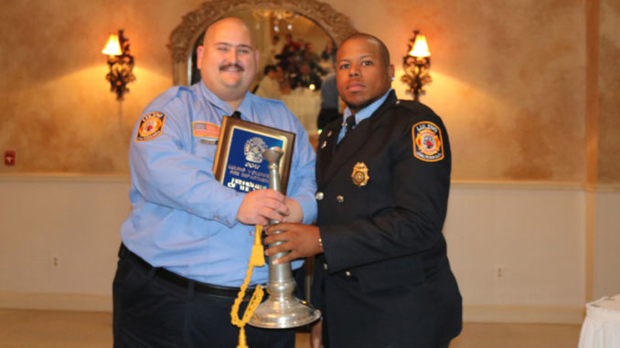 Left is Firefighter of the Year Anthony Zeller receiving the Bugle from last year’s recipient Alonzo Mitchell.
