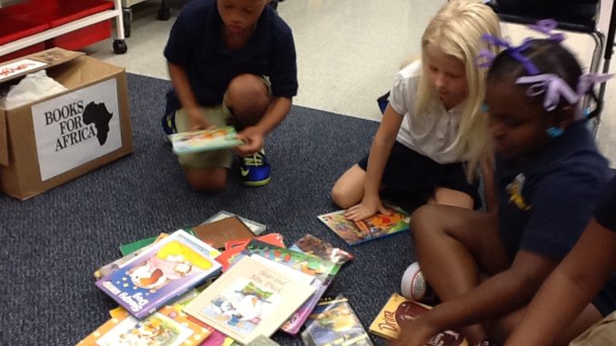 Norco Primary School recently celebrated International Literacy Day by collecting new and used books to donate to schools in Africa. First graders Jace Morris, Kaydence Pecquet and Joselyn Posey organizing the books that were collected by the school to get ready to mail to Africa.