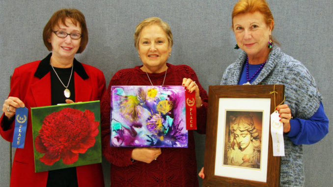 The St. Charles Artists of the month for January are (from left):1st place Joan Longo with her acrylic painting “Red Charon Peony”; 2nd place Carolyn Clausing with her acrylic ink on Yupo paper entitled, “Happy Mardi Gras.”; and 3rd place Shirley Colomb with her photograph entitled “Reflection.”