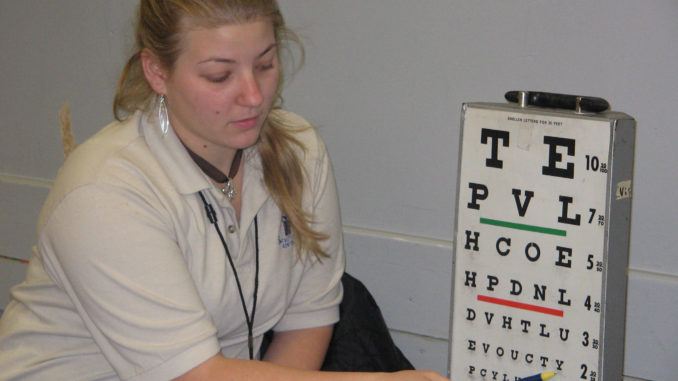 Pictured is Heidi Burnum conducting vision screenings. Health Science team members learn and apply their knowledge of these skills by courses taught at the Satellite Center and working with the school nurse in actual medical settings.