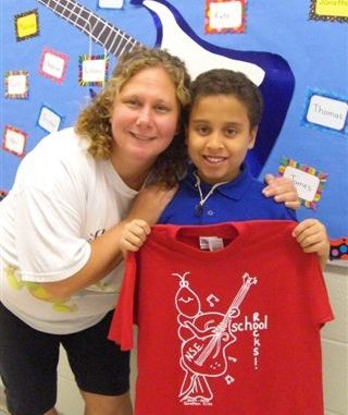 Elias’s design of a mudbug playing a guitar with the motto, “NSE School Rocks!” was selected as the favorite design. Pictured with Elias is NSE art teacher Nicole Royer.