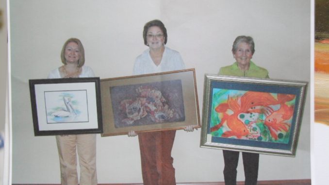 Pictured are the St. Charles Art Guild Artists of the Month for September.(From left) 1st place, Ann Clement – Pelican- watercolor; 2nd place, Reachel Mayeur- Upon the fields of poppies- batik; 3rd place, Merrill Zeringue- Playful carps – watercolor.