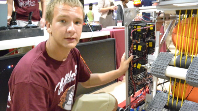 A few tables down Montz native and DHS senior Brennan Schexnaydre is showing off a robot that he helped build with the DHS Robotics Team. The robot is a large box with wiring throughout and a conveyer belt type mechanism that pulls basketballs off the ground before ejecting them through the top.