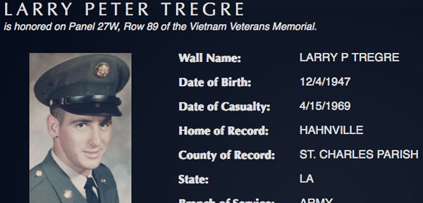 Two others are already in hand: Richard Pollard of New Sarpy, who served in the U.S. Marine Corps and died in Quang Nam on Feb. 22, 1969, and Larry Peter Tregre of Hahnville, who served in the U.S. Army and died April 15, 1969 in Tay Ninh.
