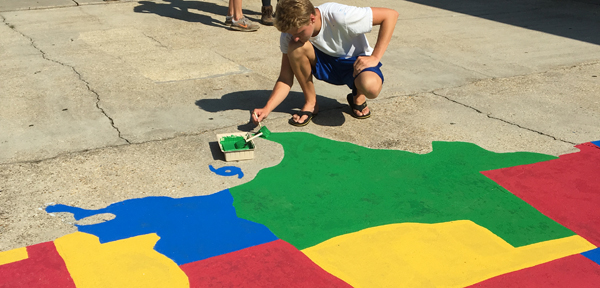 Carter decided the nation needed a new coat of paint.An estimated 21 feet wide by 12 feet long, the multi-colored map includes the nation’s 50 states and two Four Square playground game outlines.
