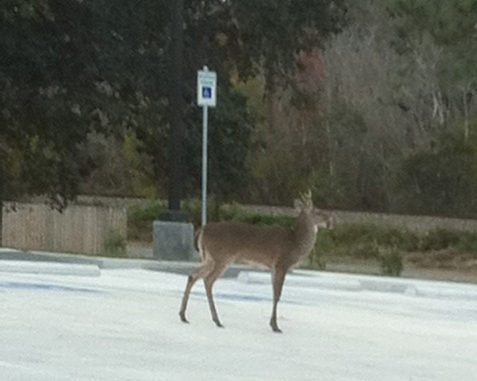 Dufrene said the deer was walking through Paradis at noon and roamed through yards around the Paradis Post Office. The doe then crossed the street and casually walked through the parking lot of the new library before heading over the railroad tracks and back into the woods.