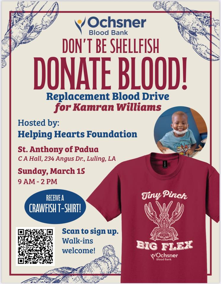 The Helping Hearts Foundation, a nonprofit organization based in the Greater New Orleans area, and Ochsner Blood Bank will host a blood drive and jambalaya sale for Kamran on Sunday, March 15 from 9 a.m. to 2 p.m. at St. Anthony of Padua in Luling. All blood types are needed, and photo IDs are required. Helping Hearts Foundation is also accepting monetary donations for Kamran and his family at donorbox.org/kamran-cancer-fundraiser.