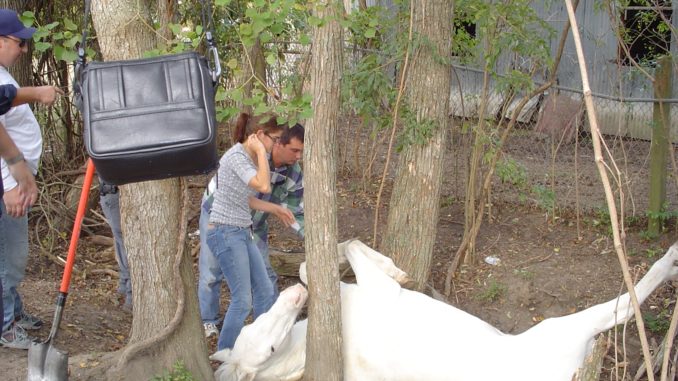 A tranquilizer was given to the horse for the animal’s and the rescuer’s safety. After 20 minutes, the firemen could safely place straps under the horse and lift his 900 plus pounds from the two trees and give Ghost the freedom he deserved.