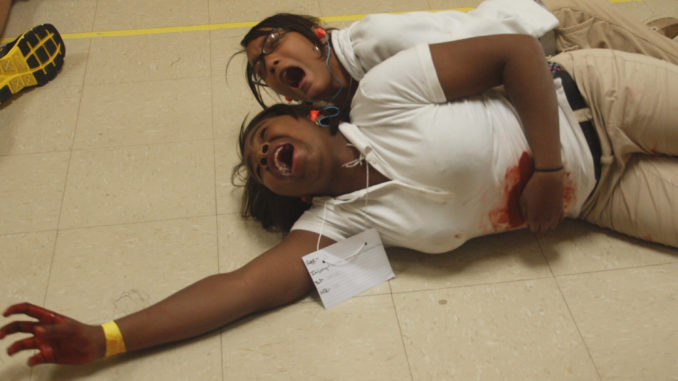 Over 100 students filled the hall, acting as gunshot victims. The fake blood-splattered teens grabbed at officers’ legs and screamed to test teachers and officers as they tried to deal with the shooting as they would in a real scenario.