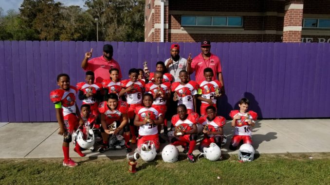 The 7 and 8-year-old St. Rose Pirates football team proudly display their league championship trophies. The Pirates earned that hardware with a championship game victory Nov. 4.
