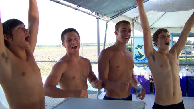 Pictured at right, team members Adam Fisher, Cameron Laurent, Jason Melancon and Jared Rodrigue celebrate the team’s record-breaking performance.